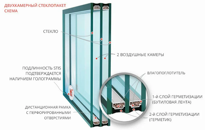 Стеклопакет состоит из двух или более листов стекла, герметично соединенных по периметру рамкой. Внутри находится осушенный воздух или инертный газ, что исключает образование конденсата при низких температурах и запотевание стекол в зимнее время. Однокамерные стеклопакеты выпускаются толщиной от 14 до 40 мм, двухкамерные стеклопакеты – от 24 до 52 мм.